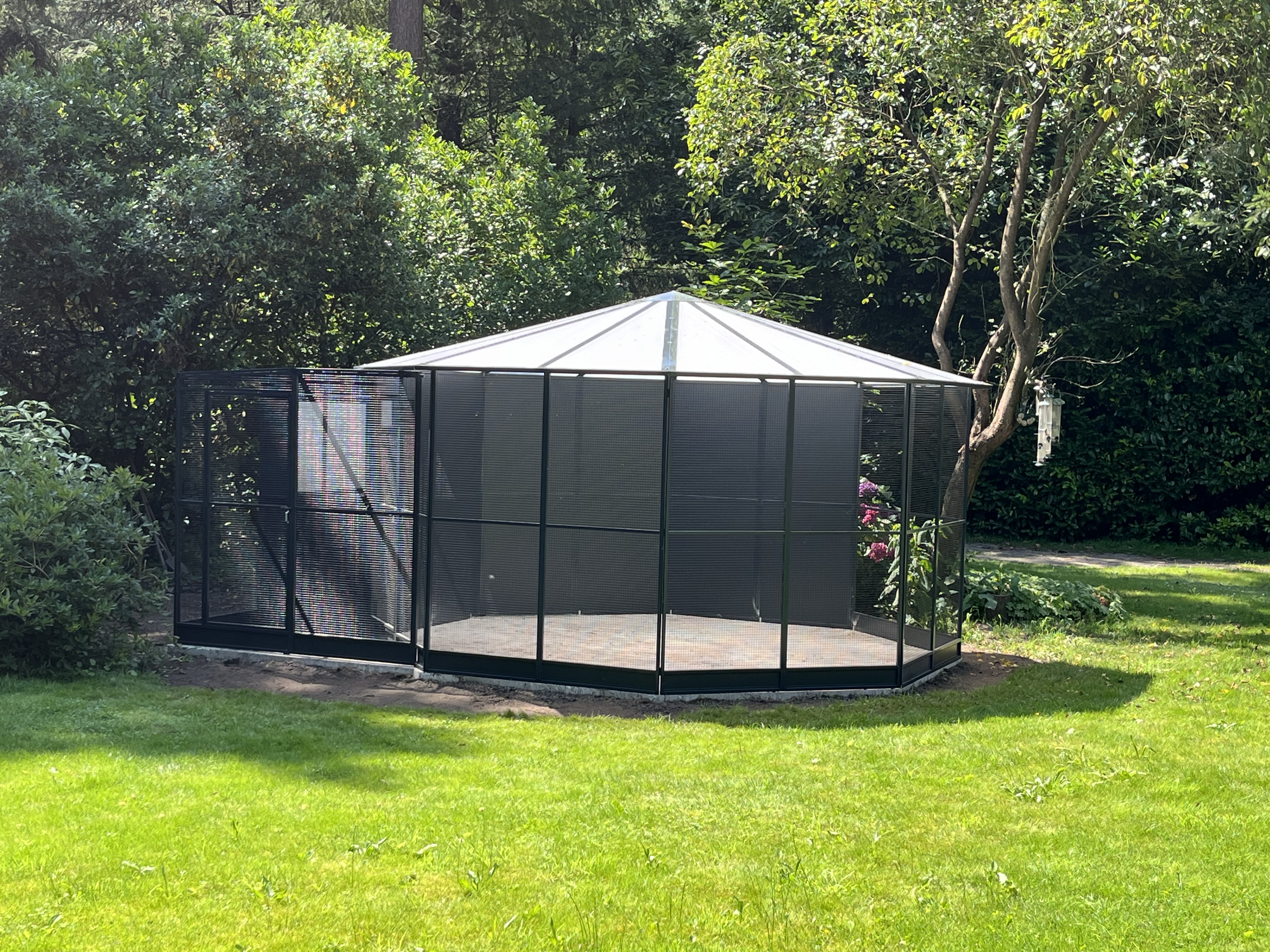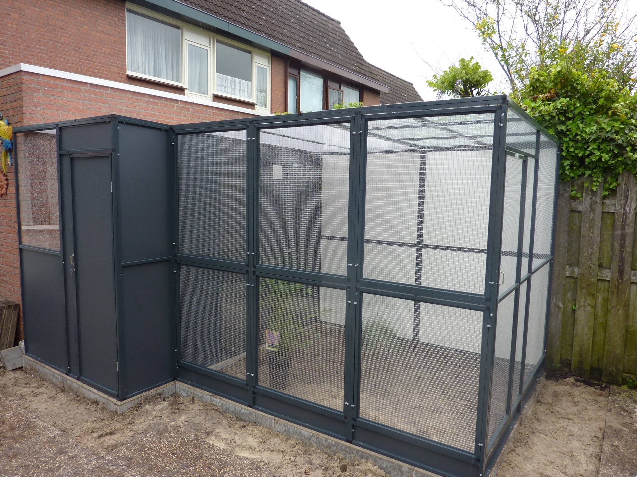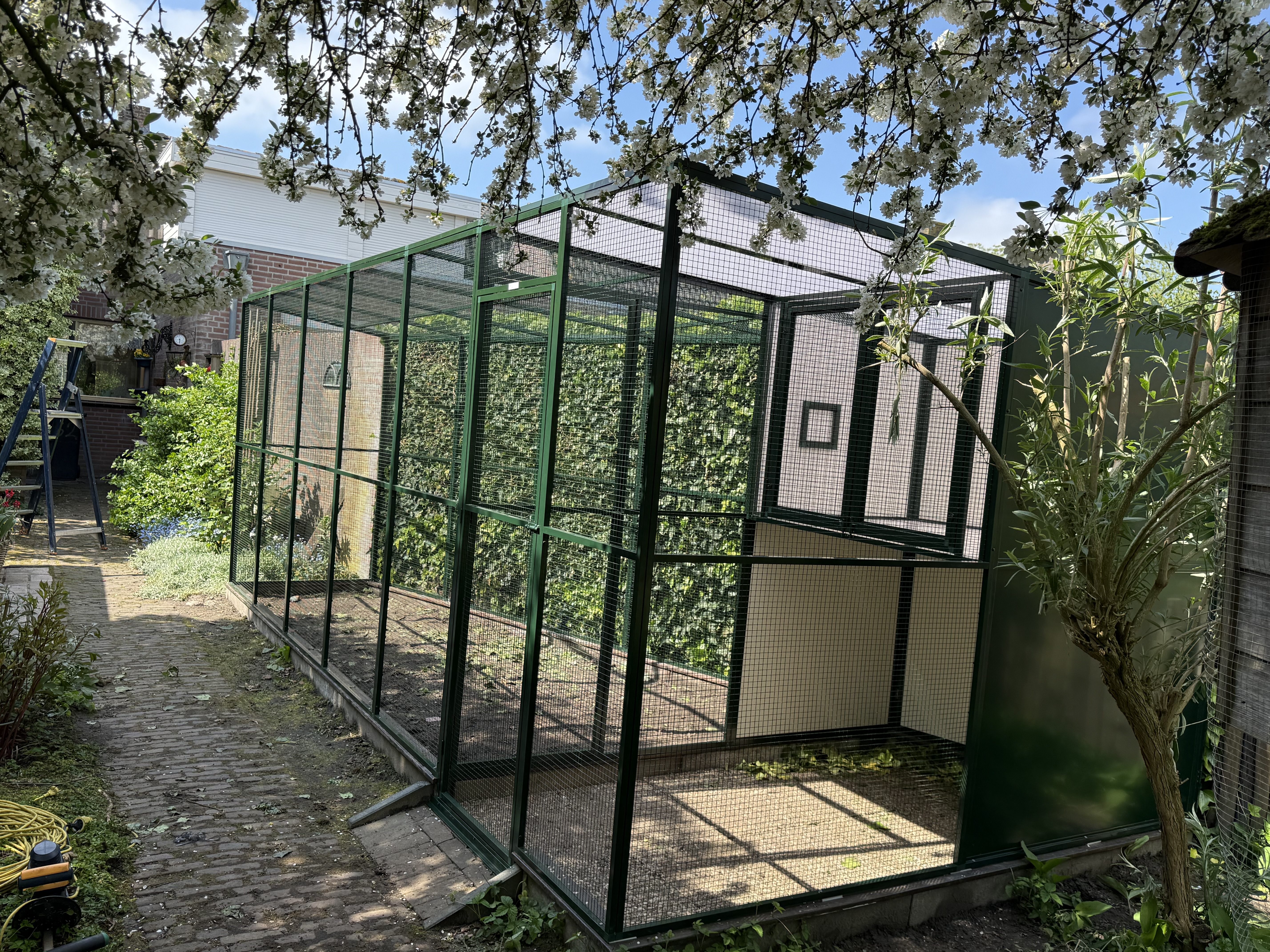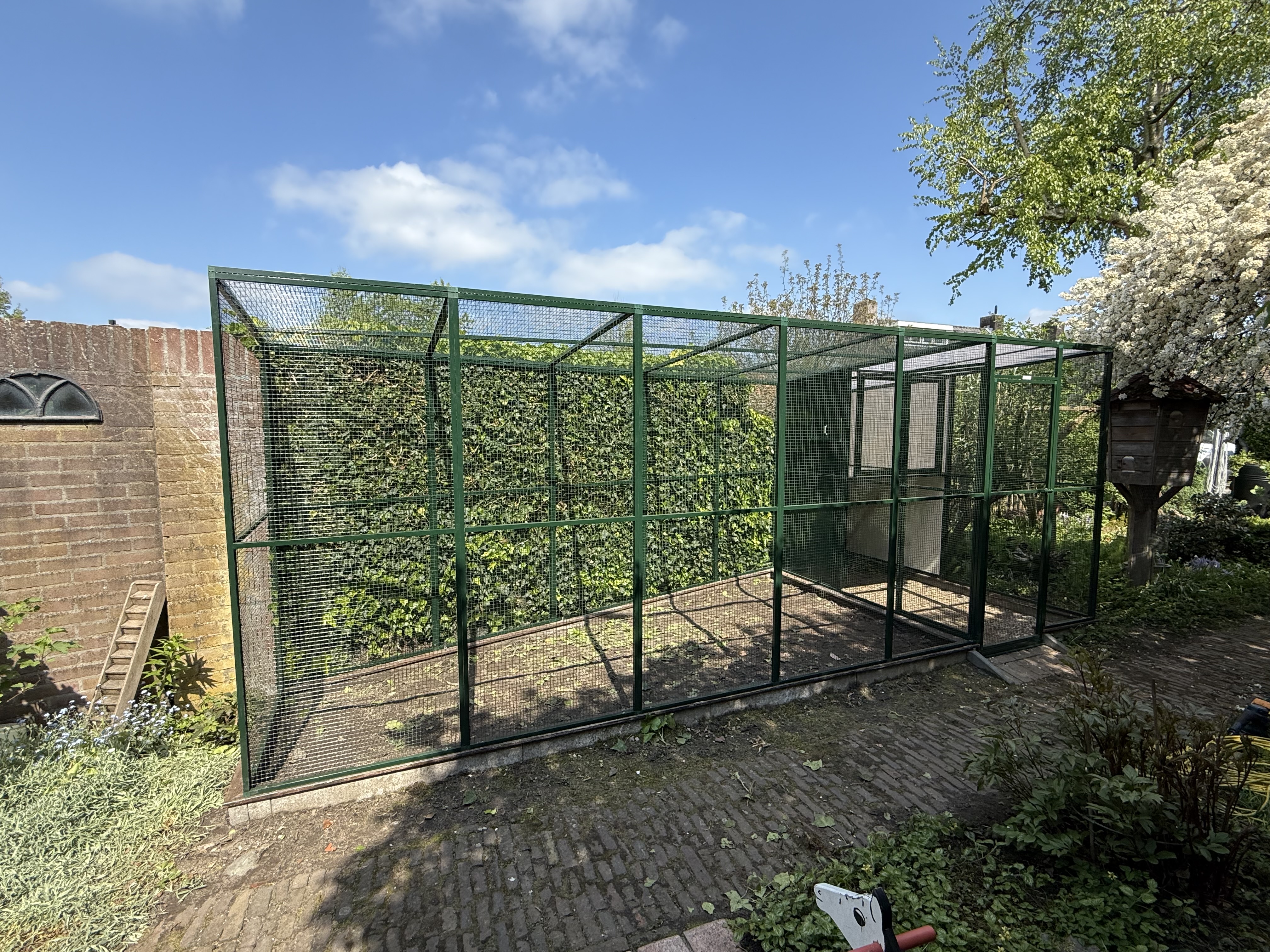 Een volière moet jarenlang meegaan, zonder dat onderhoud een last wordt. Daarom wordt gewerkt met materialen die bestand zijn tegen weer en wind, en die bovendien veilig zijn voor de vogels. Geen scherpe randen of roestgevoelige delen, maar een solide constructie met oog voor detail. Het resultaat is een nette, verzorgde volière die past bij de stijl van je tuin en die jarenlang plezier biedt — aan jou én je vogels.